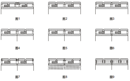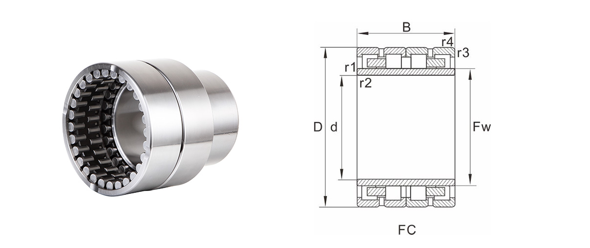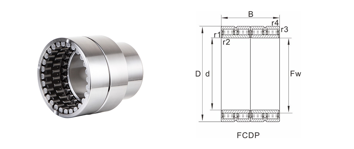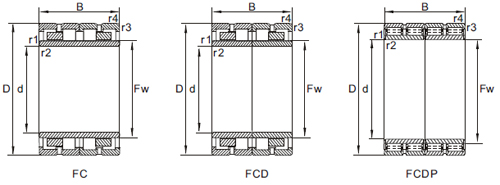 চার সারি নলাকার রোলার বিয়ারিংয়ের তিনটি মৌলিক প্রকার রয়েছে: FC, FCD এবং FCDP প্রকার, অনুসরণ স্কেচ হিসাবে দেখানো হয়েছে।